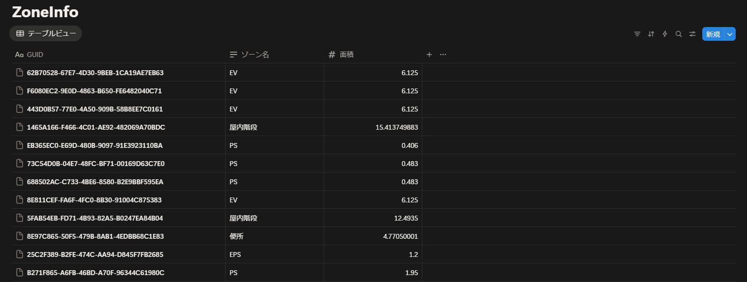 今回はゾーンのGUID、ゾーン名、面積を取得します。